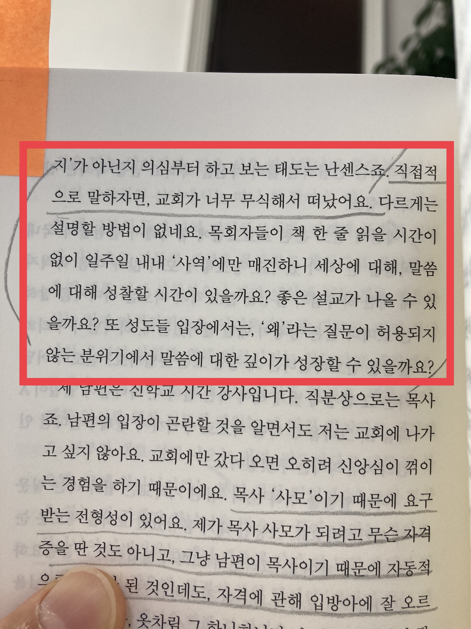 "직접적으로 말하자면, 교회가 너무 무식해서 떠났어요. 다르게는 설명할 방법이 없네요. 목회자들이 책 한 줄 읽을 시간이 없이 일주일 내내 '사역'에만 매진하니 세상에 대해, 말씀에 대해 성찰할 시간이 있을까요? 좋은 설교가 나올 수 있을까요? 또 성도들 입장에서는, '왜'라는 질문이 허용되지 않는 분위기에서 말씀에 대해 깊이가 성장할 수 있을까요?"