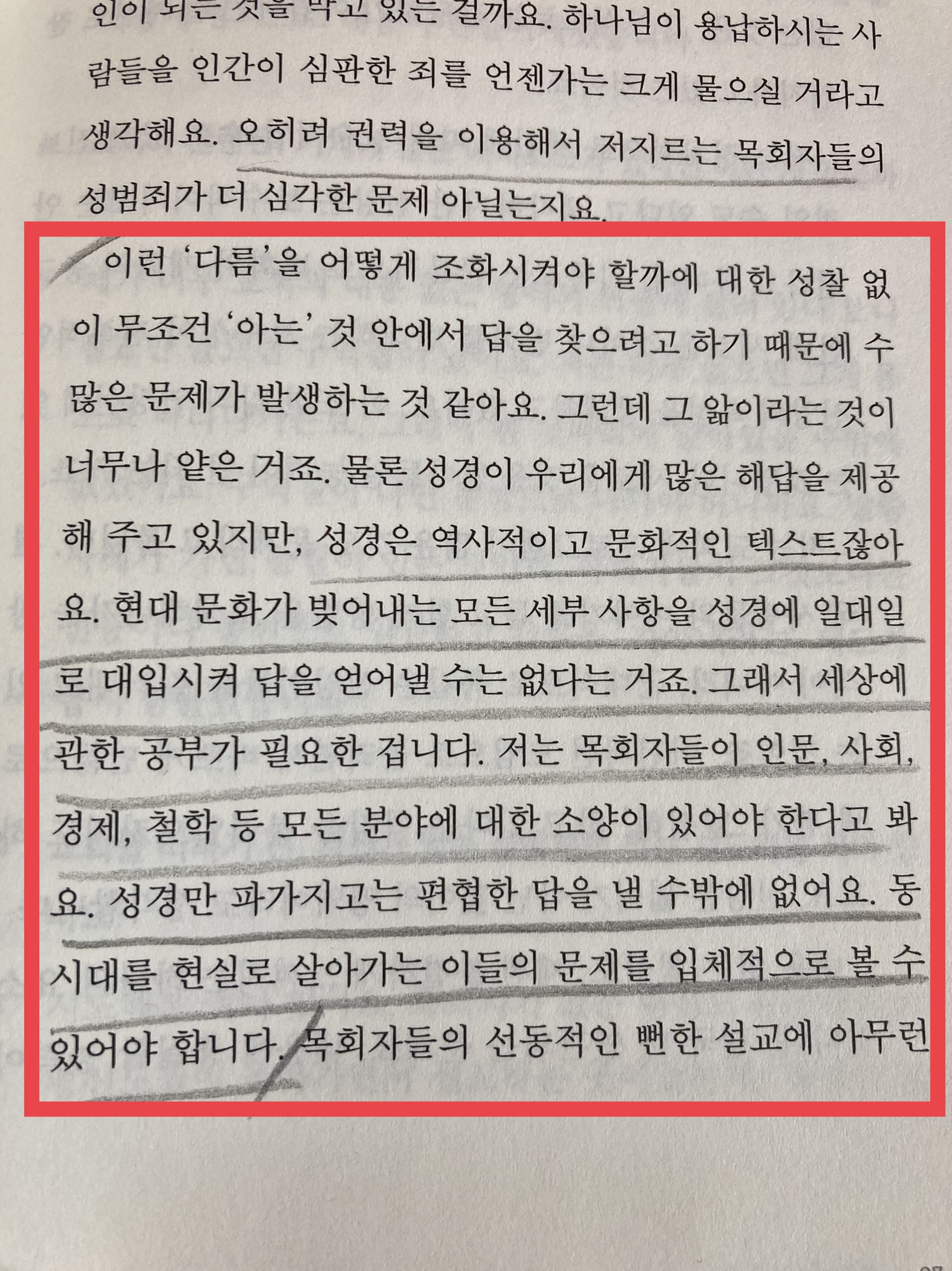 "성경은 역사적이고 문화적인 텍스트잖아요. 현대 문화가 빚어내는 모든 세부 사항을 성경에 일대일로 대입시켜 답을 얻어낼 수는 없다는거죠. 그래서 세상에 관한 공부가 필요한 겁니다. 저는 목회자들이 인문, 사회, 경제, 철학 등 모든 분야에 대한 소양이 있어야 한다고 봐요. 성경만 파가지고는 편협한 답을 낼 수밖에 없어요. 동시대를 현실로 살아가는 이들의 문제를 입체적으로 볼 수 있어야 합니다."
